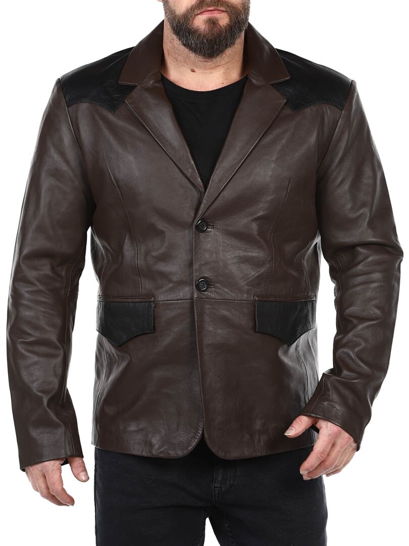 Ruskea bleiseri, jossa on mustat matelijakuviollinen hartiaosa ja taskuläppä. Yksirivinen malli, jossa kaulus ja kaksi etutaskua sekä kaksi sisätaskua. Tämä takki on valmistettu pehmeästä nahasta parhaan käyttömukavuuden takaamiseksi, ja se on saatavilla vain RockDenimiltä!