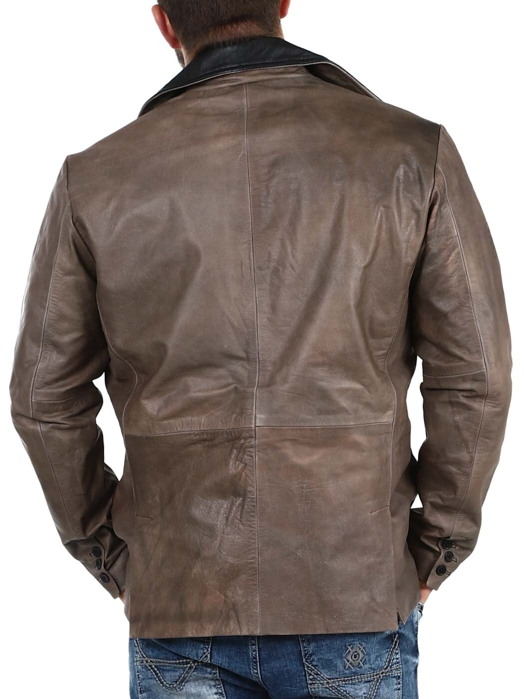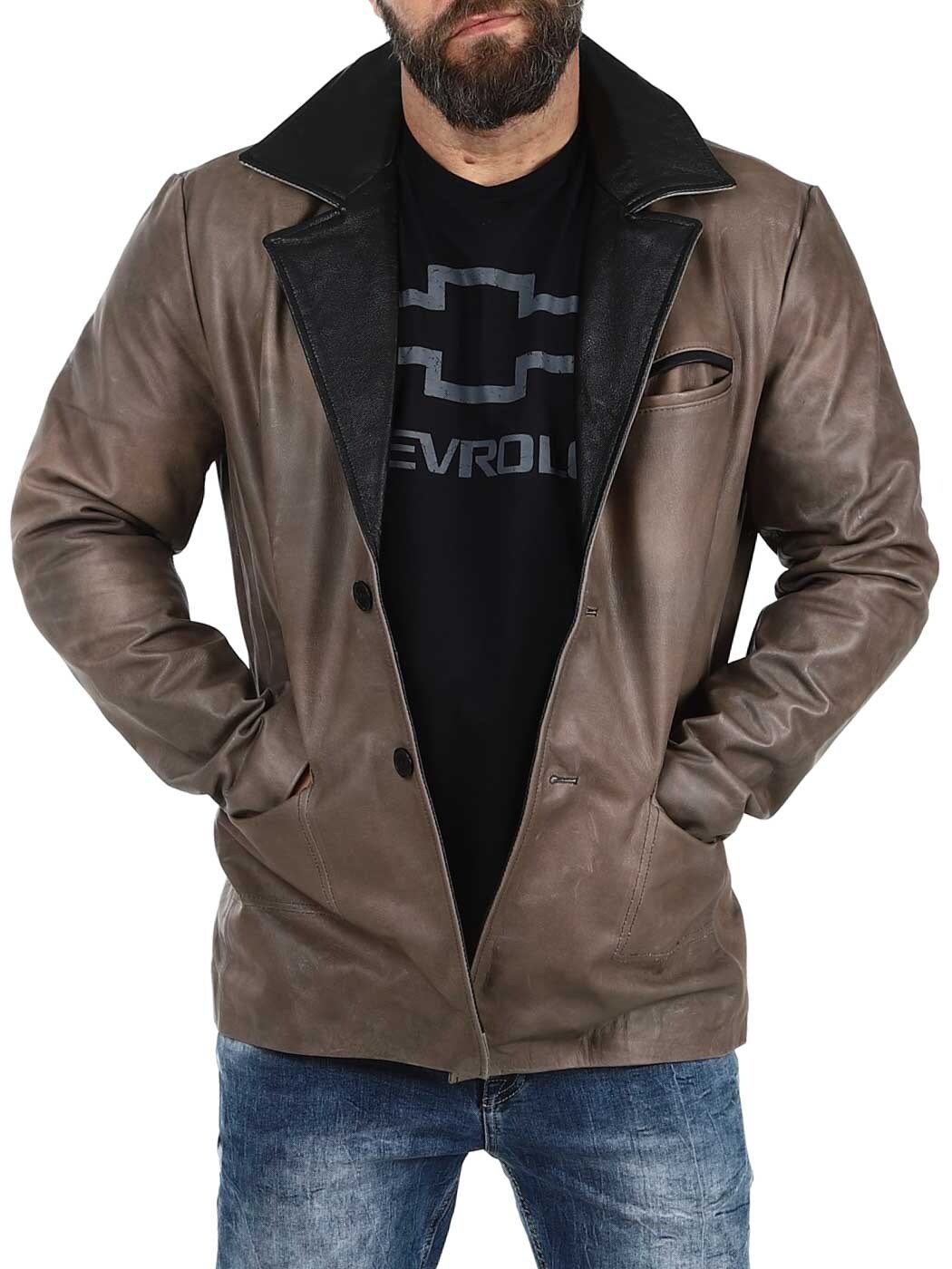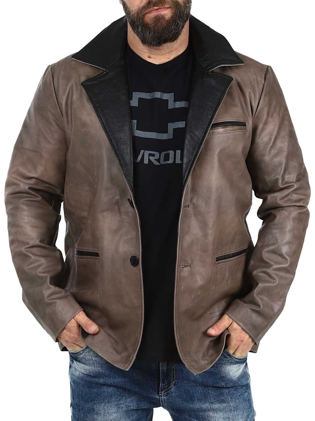 Ruskea nahkableiseri kestävästä nahasta vintage-tyylillä ja mustilla kontrastiyksityiskohdilla. Yksirivinen malli klassisella kauluksella, kolmella etutaskulla sekä kahdella sisätaskulla. Saatavilla vain RockDenim!