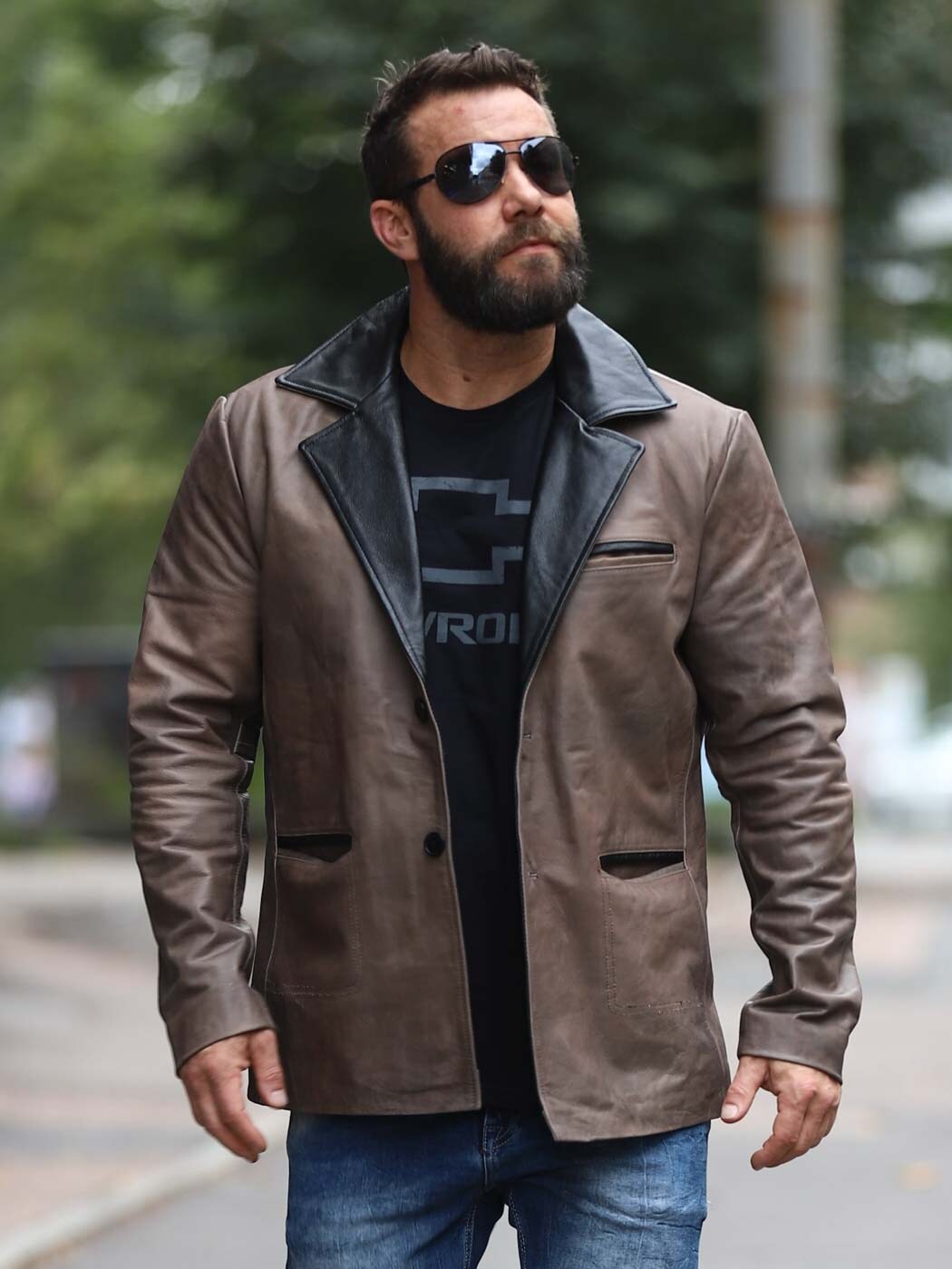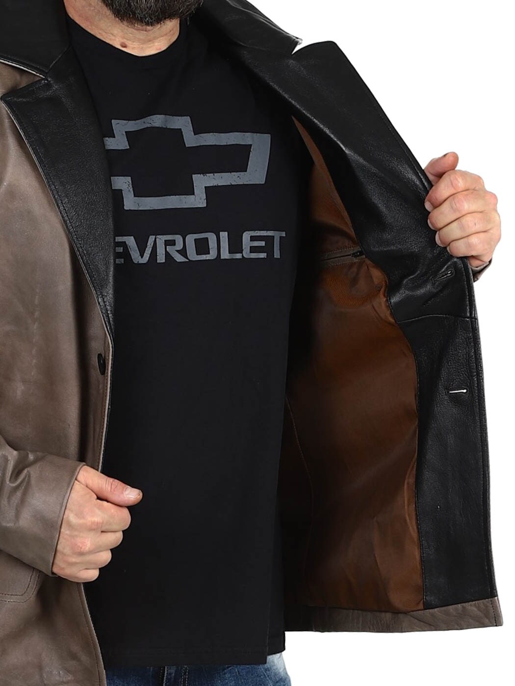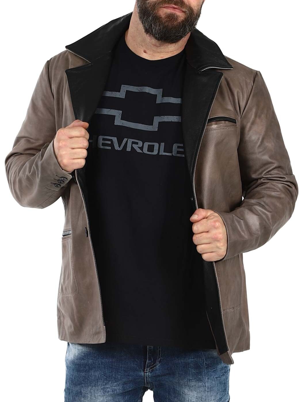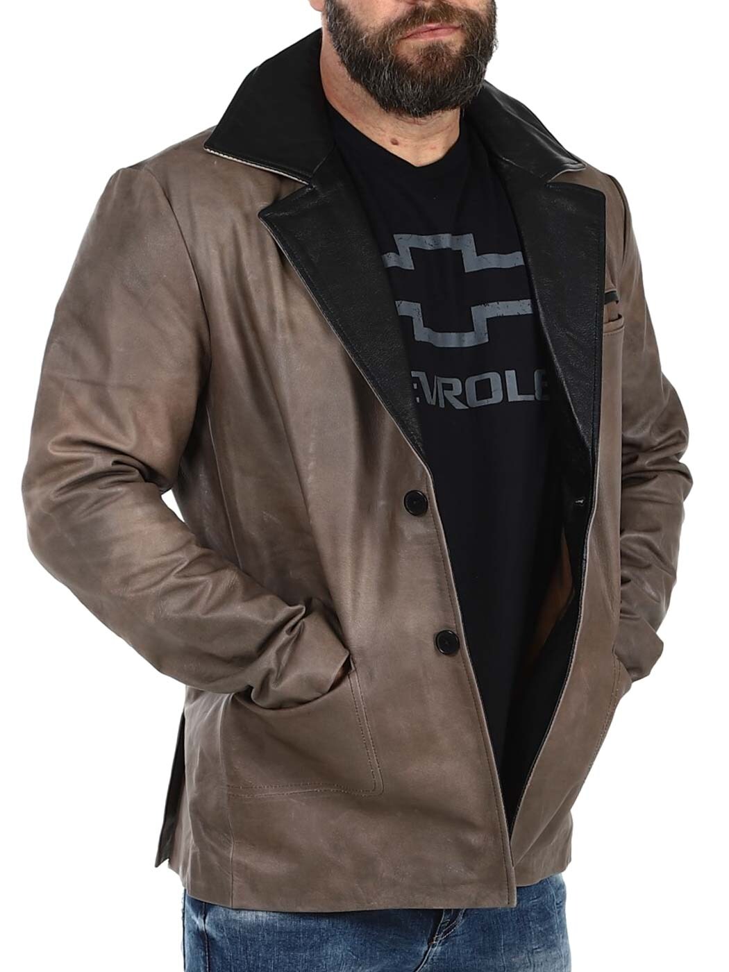Ruskea nahkableiseri kestävästä nahasta vintage-tyylillä ja mustilla kontrastiyksityiskohdilla. Yksirivinen malli klassisella kauluksella, kolmella etutaskulla sekä kahdella sisätaskulla. Saatavilla vain RockDenim!
