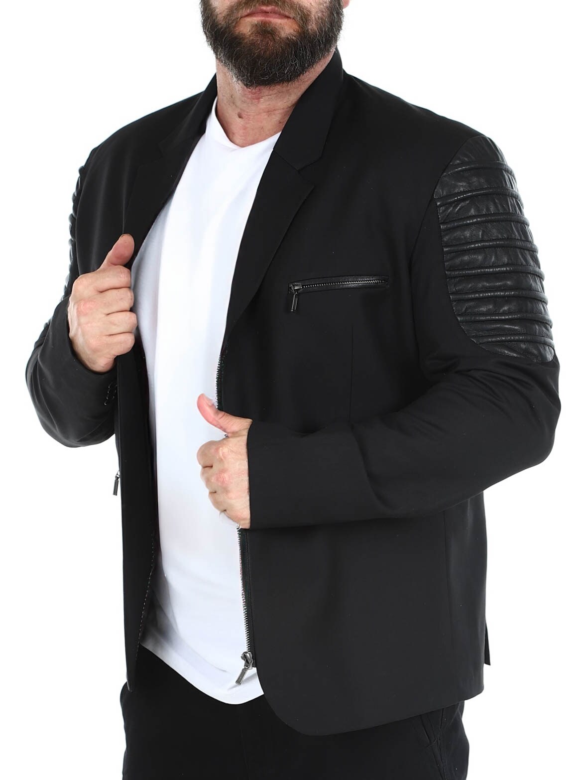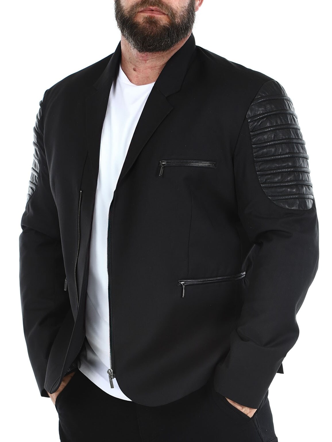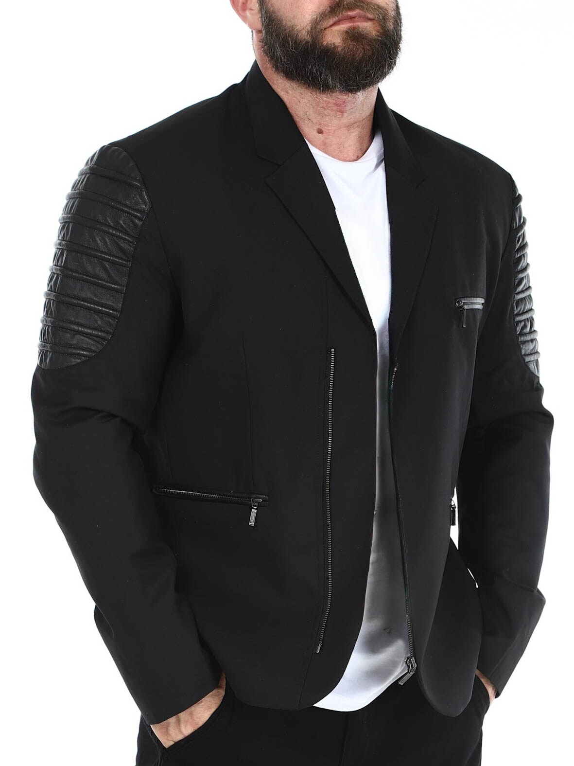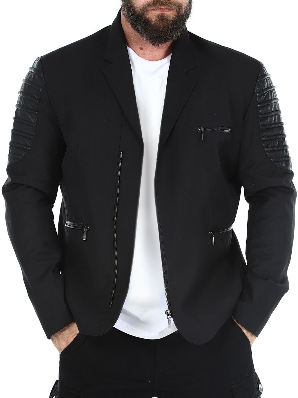 Puuvillatakki, jossa on vetoketjukiinnitys ja tekonahkaisia osioita. Takissa on kolme vetoketjullista etutaskua ja kolme avointa sisätaskua. Tämä rokkaava bleiseri on saatavilla vain RockDenimiltä!