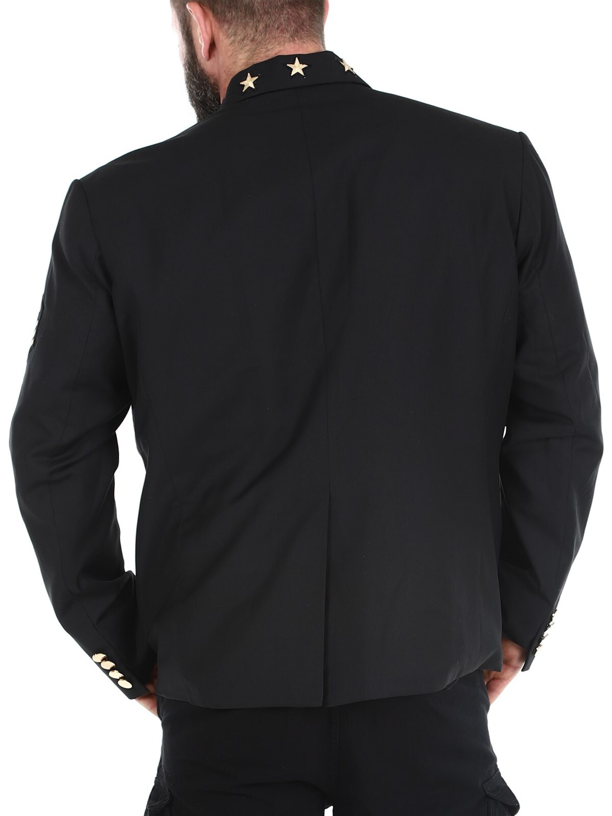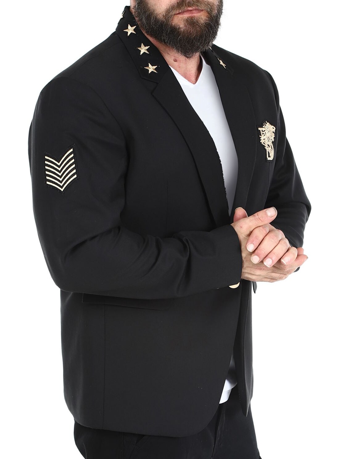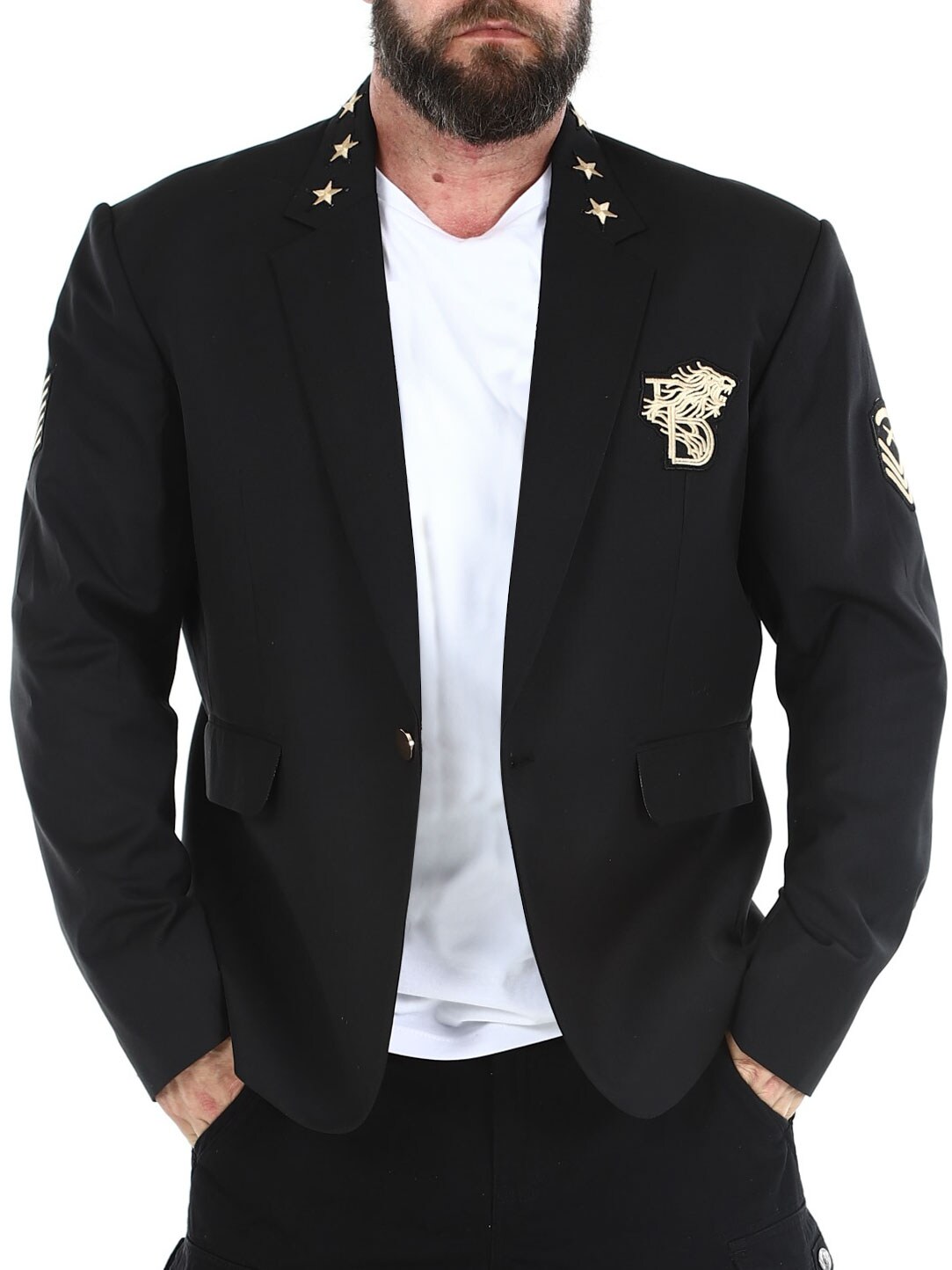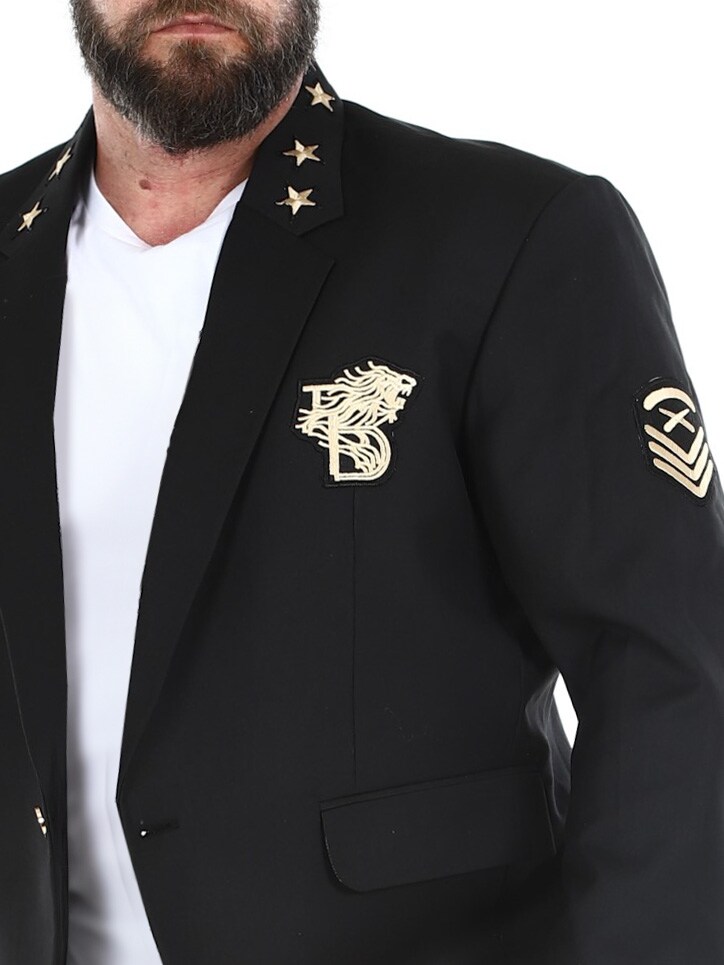 Musta bleiseri kullanvärisillä kangaslapuilla. Yksirivinen malli, jossa on kaulus, kaksi etutaskua ja kolme sisätaskua. Tämä bleiseri on valmistettu pehmeästä puuvillasta parhaan käyttömukavuuden takaamiseksi, ja se on saatavilla vain RockDenimiltä!
