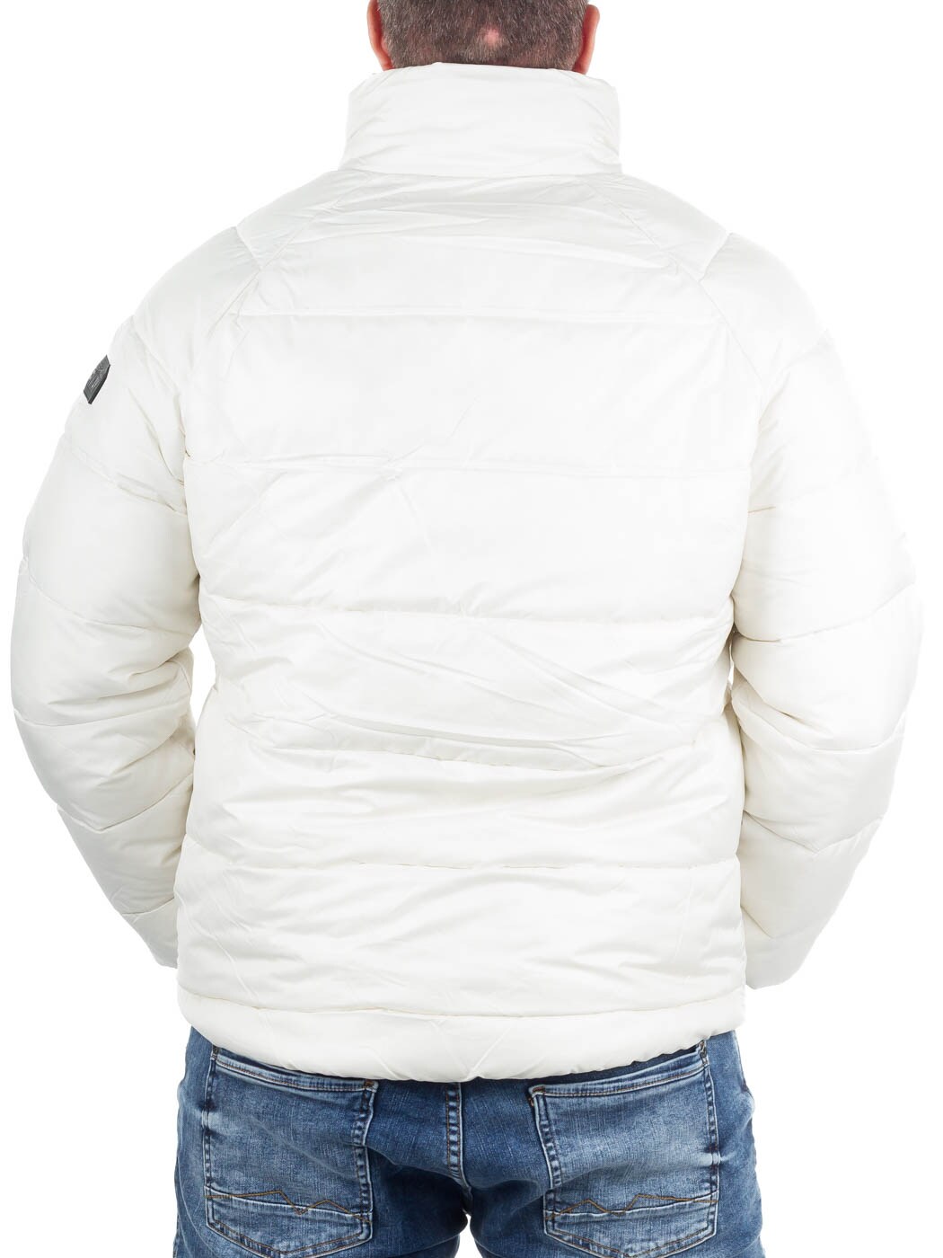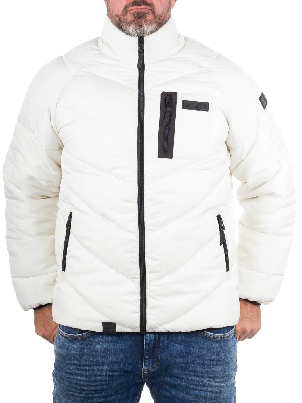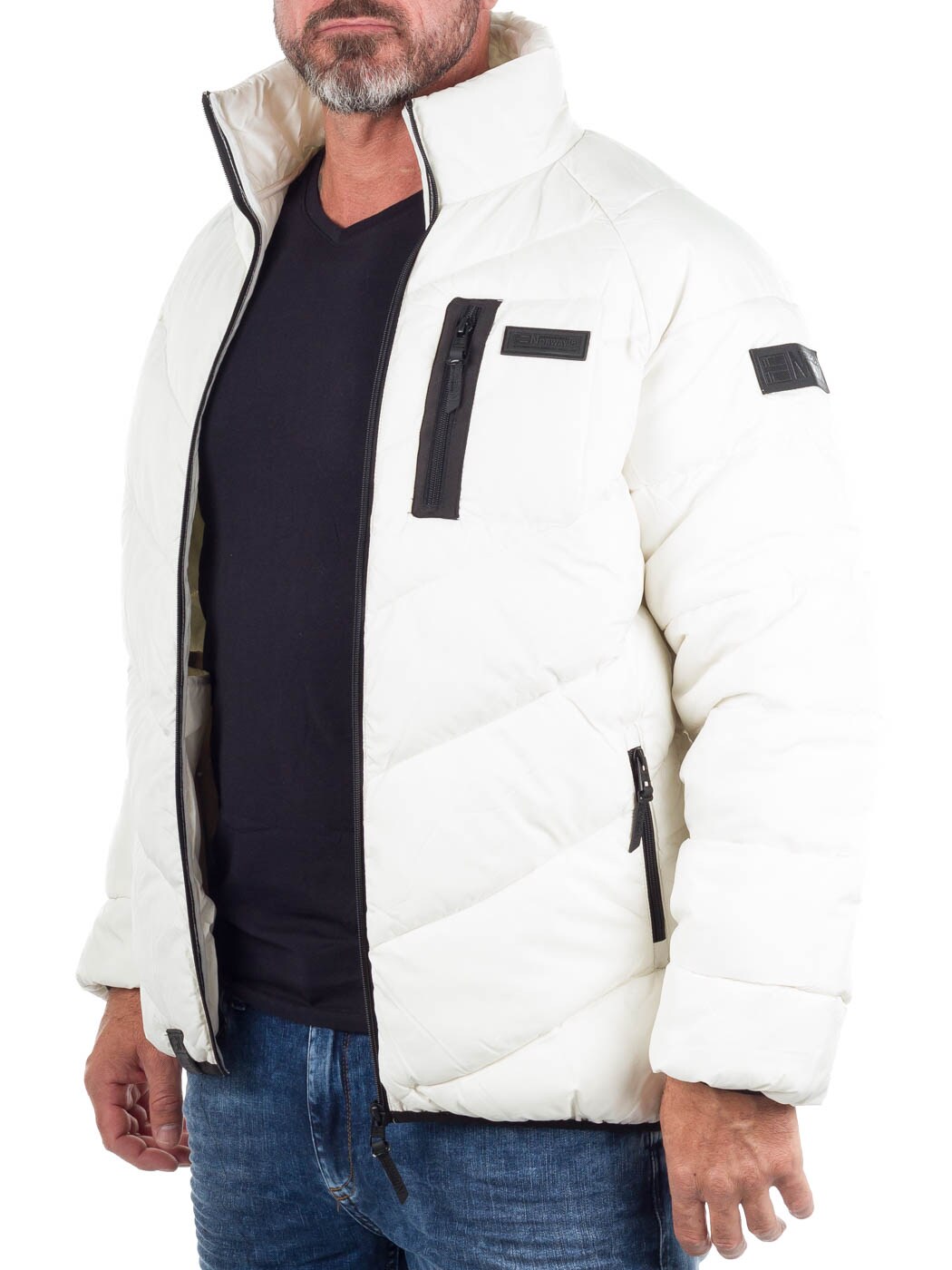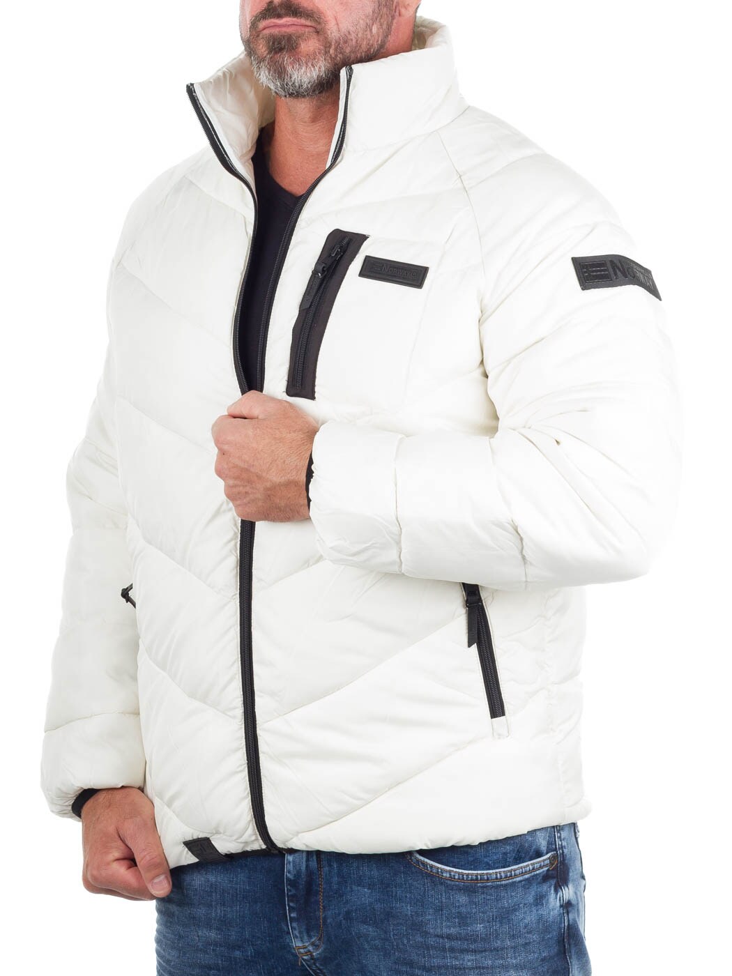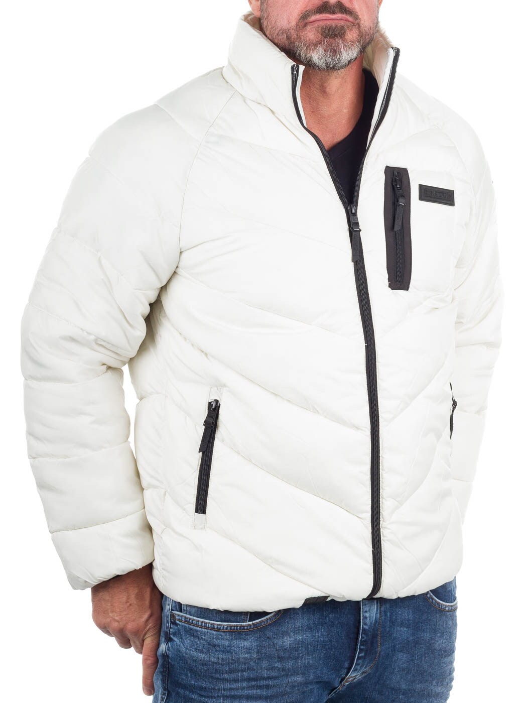 Valkoinen toppatakki mustilla kontrastiyksityiskohdilla. Kevyt ja mukava, mutta silti lämmin viileinä päivinä. Mallissa on korkea kaulus, vetoketjukiinnitys ja useita käytännöllisiä vetoketjutaskuja.