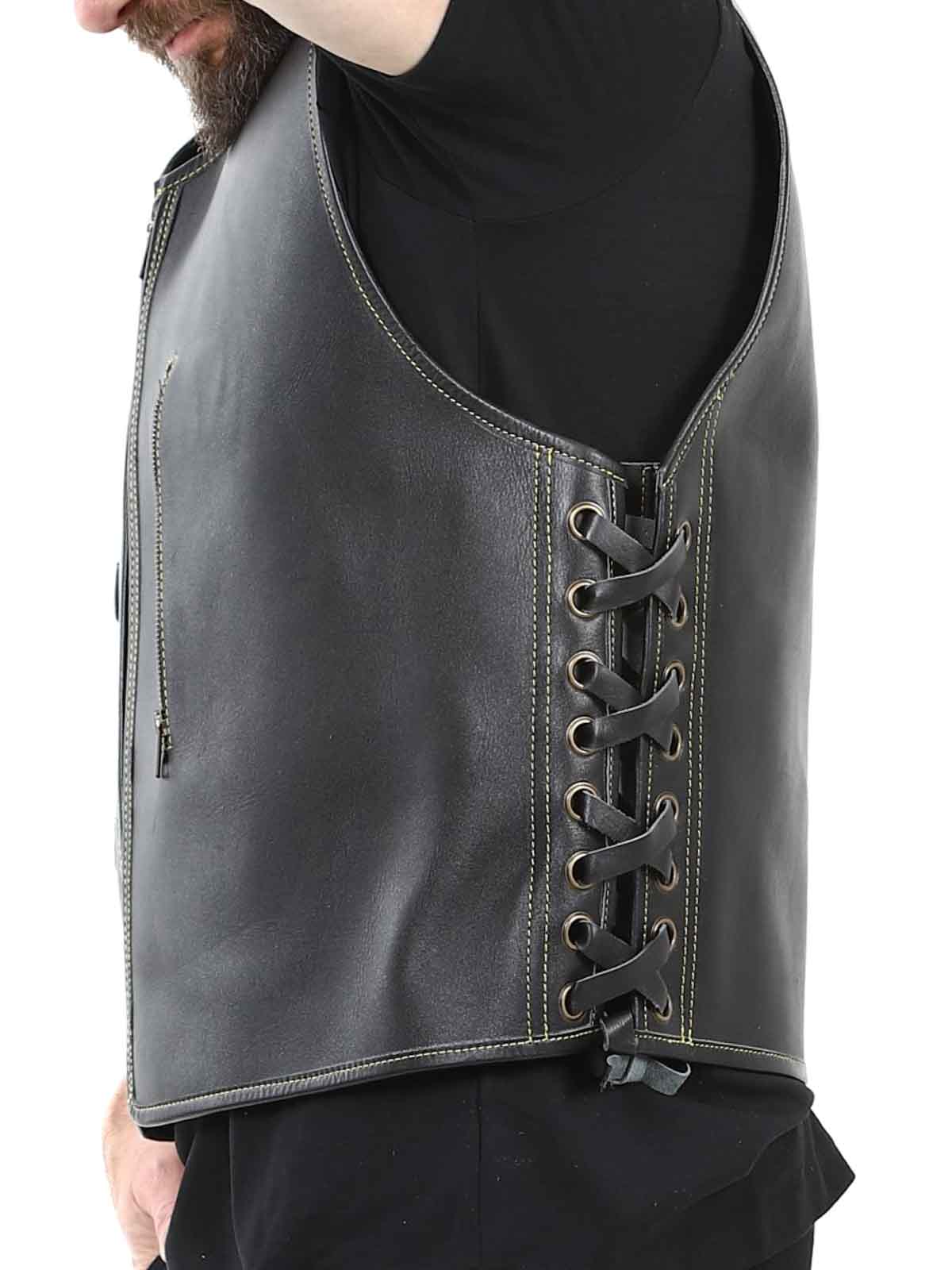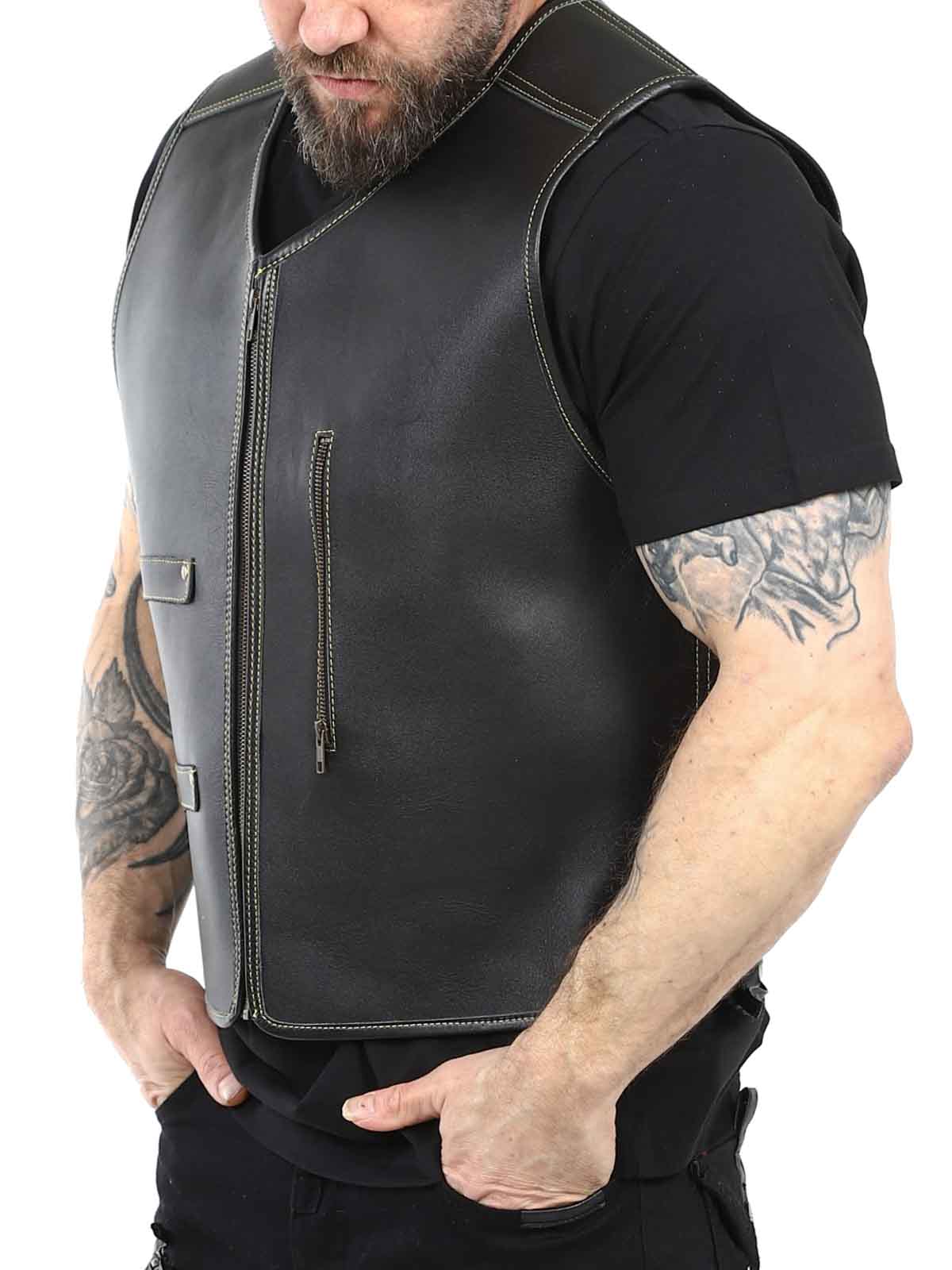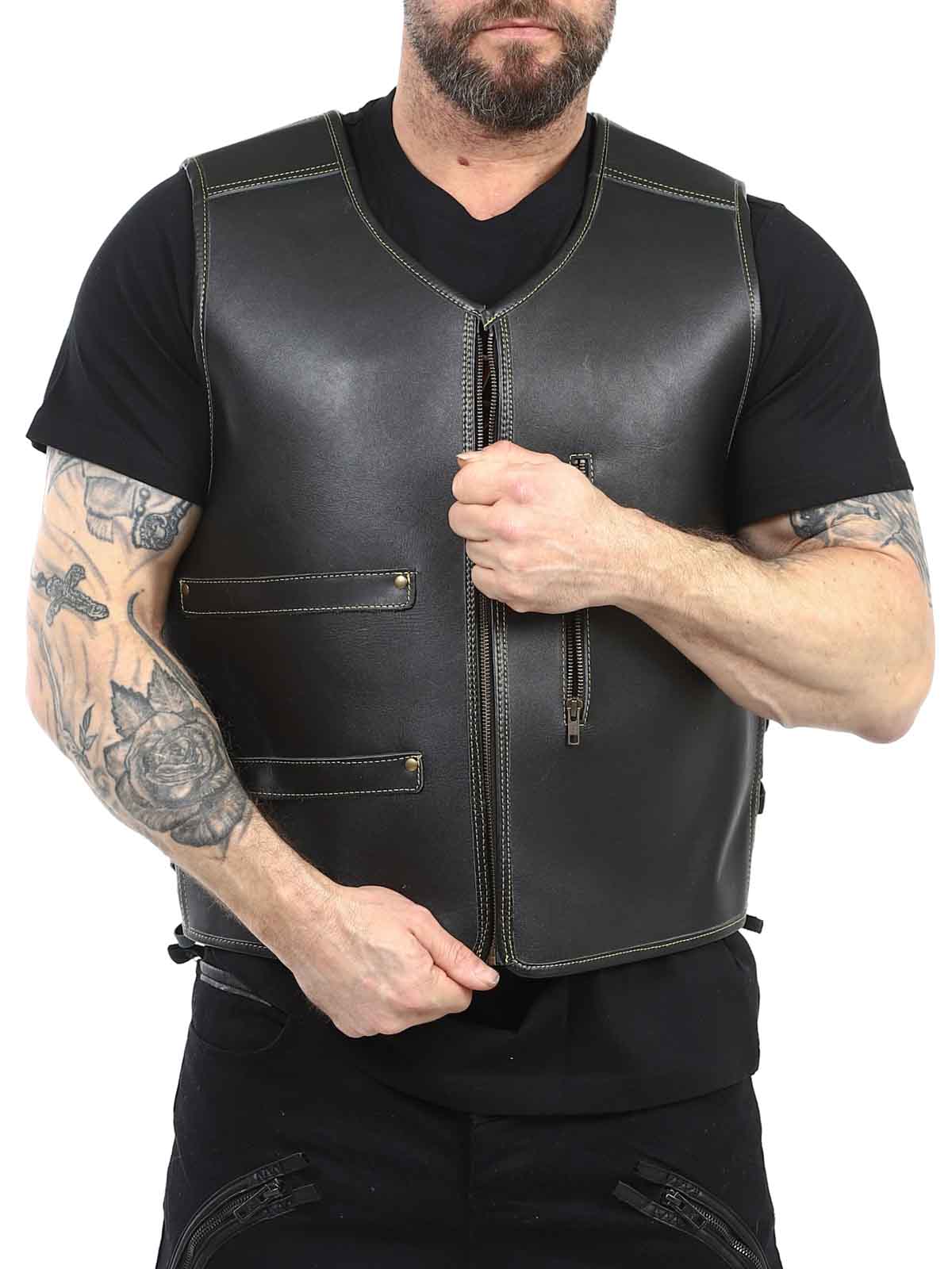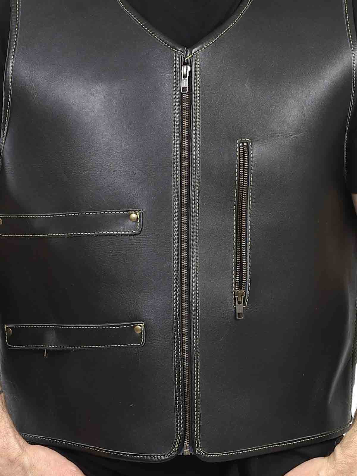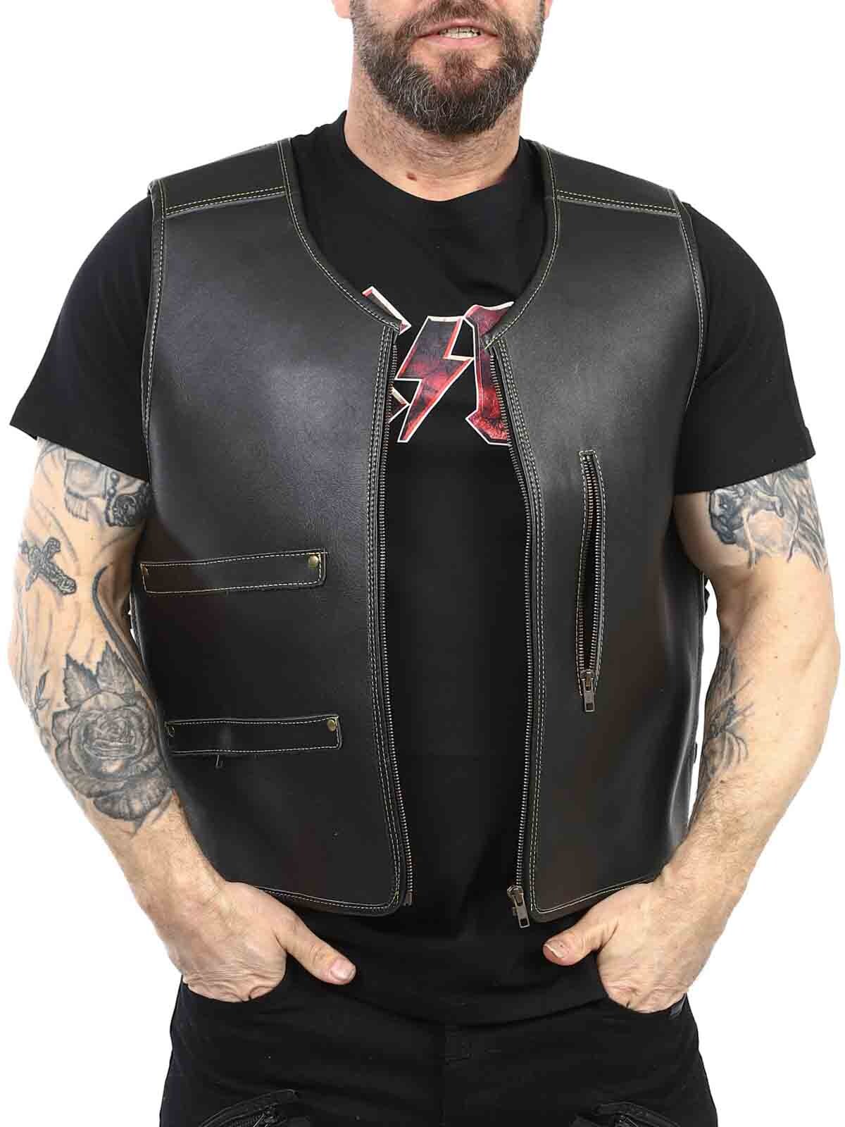 Jämäkkä puhvelinnahkainen liivi, jossa on erottuvat saumat. Liivissä on kolme etutaskua ja kolme sisätaskua, joissa kaikissa on vetoketju turvallista säilytystä varten. Sivupunokset mahdollistavat säädettävän istuvuuden ja tyylikkään ilmeen. Lujatekoisuutensa ja laadukkaiden yksityiskohtiensa ansiosta liivi sopii yhtä hyvin niin tien päälle kuin niille, jotka haluavat lisätä kaappiinsa todellisen statement-vaatekappaleen!