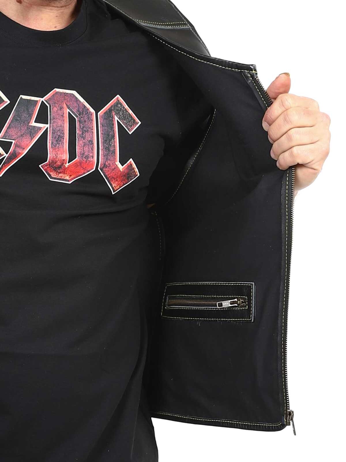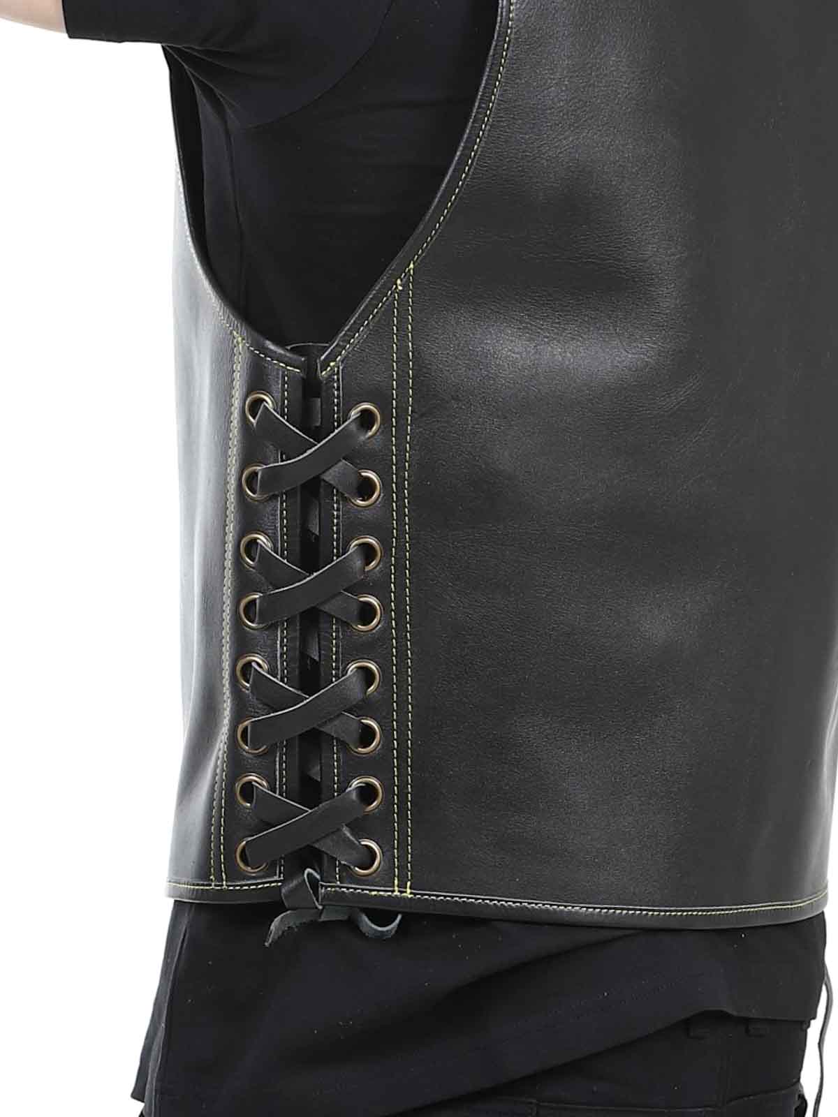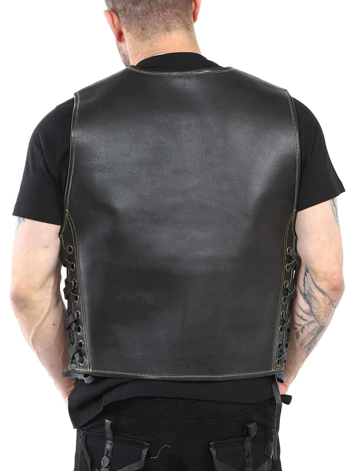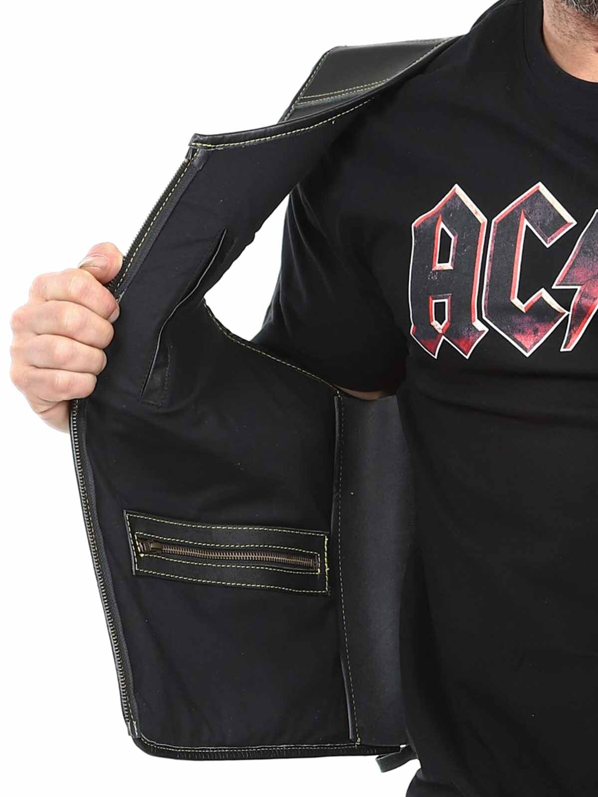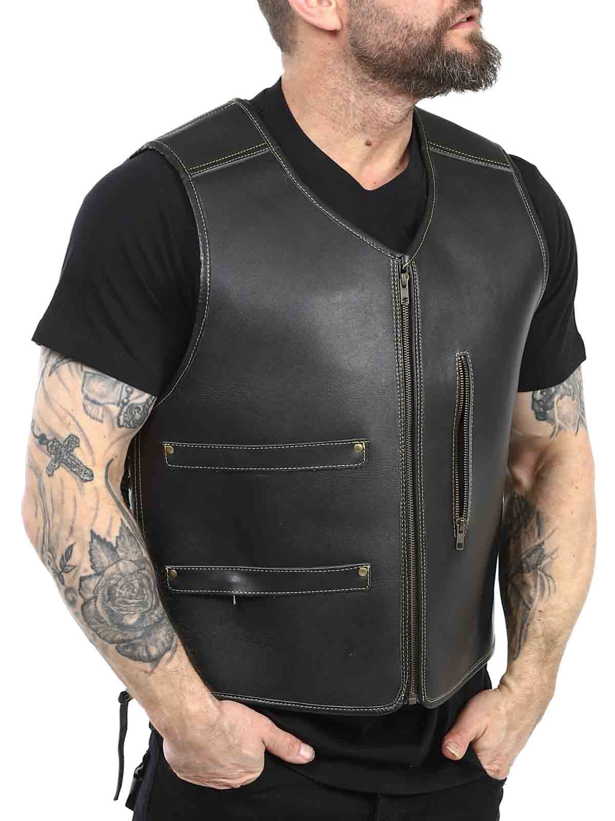 Jämäkkä puhvelinnahkainen liivi, jossa on erottuvat saumat. Liivissä on kolme etutaskua ja kolme sisätaskua, joissa kaikissa on vetoketju turvallista säilytystä varten. Sivupunokset mahdollistavat säädettävän istuvuuden ja tyylikkään ilmeen. Lujatekoisuutensa ja laadukkaiden yksityiskohtiensa ansiosta liivi sopii yhtä hyvin niin tien päälle kuin niille, jotka haluavat lisätä kaappiinsa todellisen statement-vaatekappaleen!