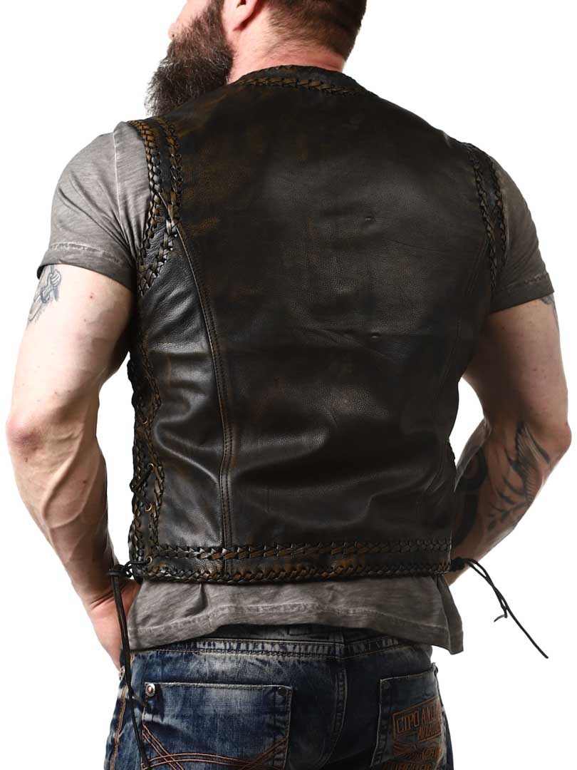Aito nahkaliivi, jossa on tyylikäs vintage-look ja punottu nahkakoristelu. Liivissä on kaksi etutaskua, kaksi sisätaskua ja nauhat sivuilla. Liivi suljetaan lujatekoisilla metallisoljilla. Saatavana vain RockDenimiltä!