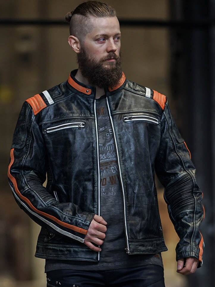 Vintage-tyylinen takki raidoilla sekä valkoisilla ja oransseilla yksityiskohdilla. Takissa on neljä suljettavaa etutaskua, kaksi sisätaskua ja matala kaulus. Tämä ainutlaatuinen nahkatakki on valmistettu laadukkaasta nahasta, ja sen suunnittelussa Rockdenim on ammentanut inspiraatiota moottoriurheilusta.