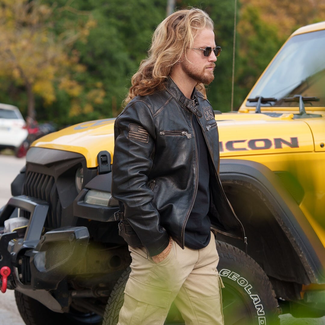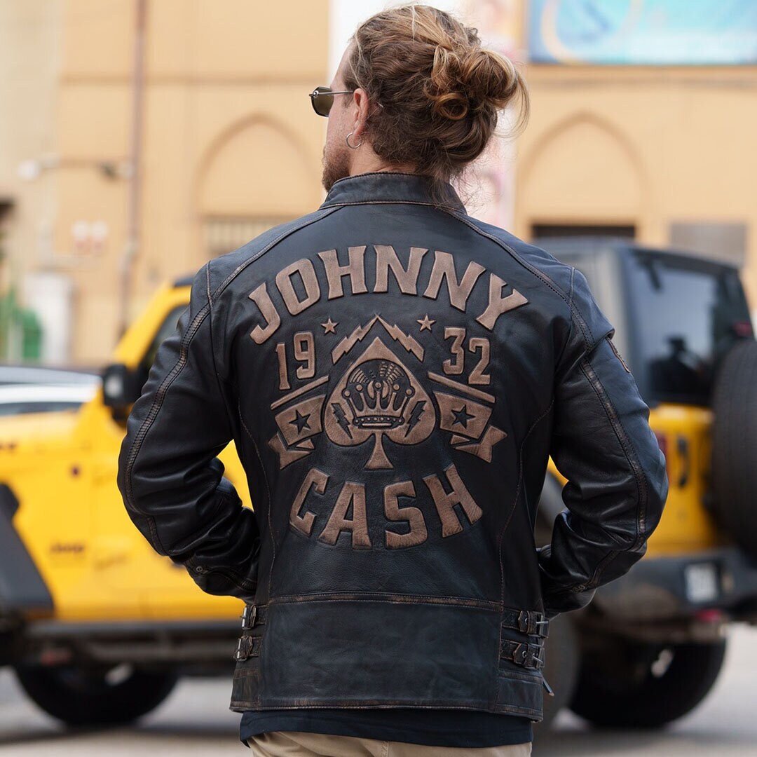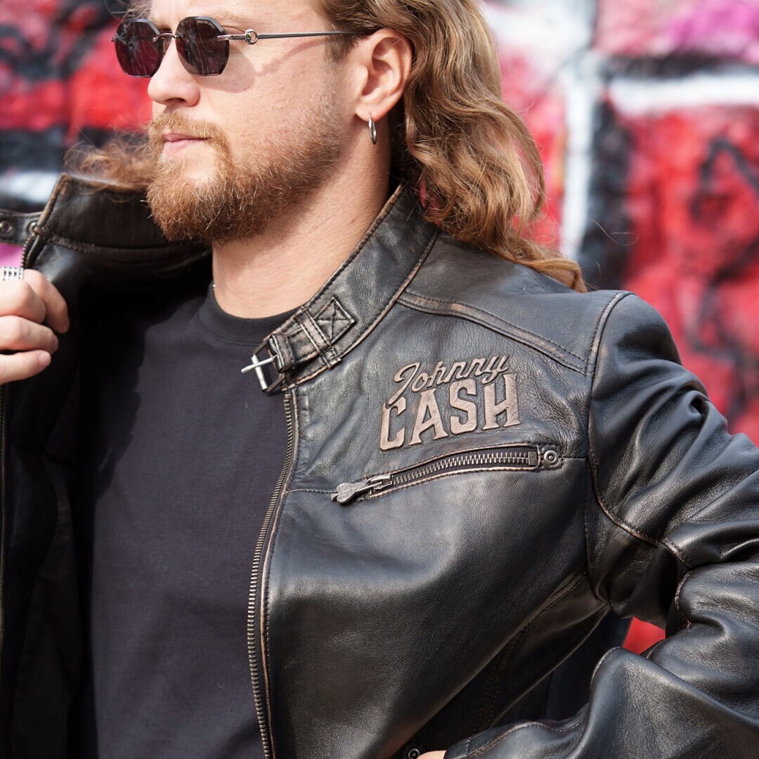 Tämä asukokonaisuus on suunniteltu miehelle, joka ei tyydy tavanomaiseen. Johnny Cash -teemainen nahkatakki on asun sielu, tarjoten vintage-henkeä ja tinkimätöntä tyyliä.