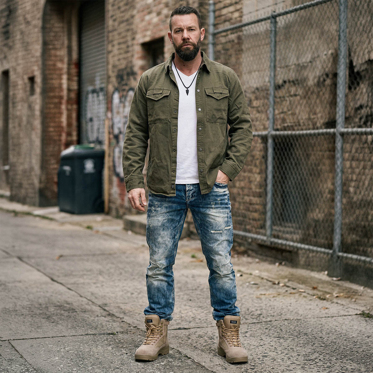 Etsitkö asukokonaisuutta, jossa yhdistyvät kestävyys, maskuliinisuus ja urbaani katutyyli? Tämä asu on suunniteltu miehelle, joka ei tee kompromisseja tyylin eikä laadun suhteen. Armeijahenkisyys ja revityt yksityiskohdat luovat lyömättömän yhdistelmän.